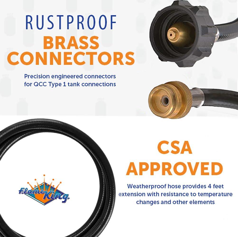 Create that natural and calming environment with the Flame King Mini Tabletop Fire Pit, your perfect buddy for a cozy atmosphere while roasting marshmallows, or simply enjoying the flicker of a flame without needing a large outdoor setup. This Mini Pit is compact, portable and lightweight, and designed to bring ambiance to almost any patio dining or lounge area. The Flame King Mini Pit is CSA-approved and is safe to use, stylish, and elegant, measuring 8 X 11 inches. Burns clean and smokeless flame, comes with natural rocks to enhance flickering effect, and flame height is adjustable with the control knob. Compatible with both propane and butane (butane to propane adapter included). Butane Gas Canister and Flame King 0.5 Propane Cylinder are sold separately. Can also be attached to a larger tank using the Flame King 4-FT Adapter Propane Hose; must be used on a table with umbrella hole when used with propane hose. Flame King's 4-FT propane adapter hose connects your 1LB appliance to a 20LB propane tank using a QCC1/Type 1 connection. The hose tethers to the CGA hook on your propane-powered appliances, including fire pits, camping stoves, tabletop grills, lanterns, and more.