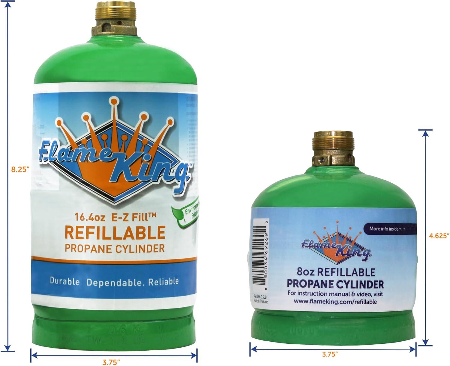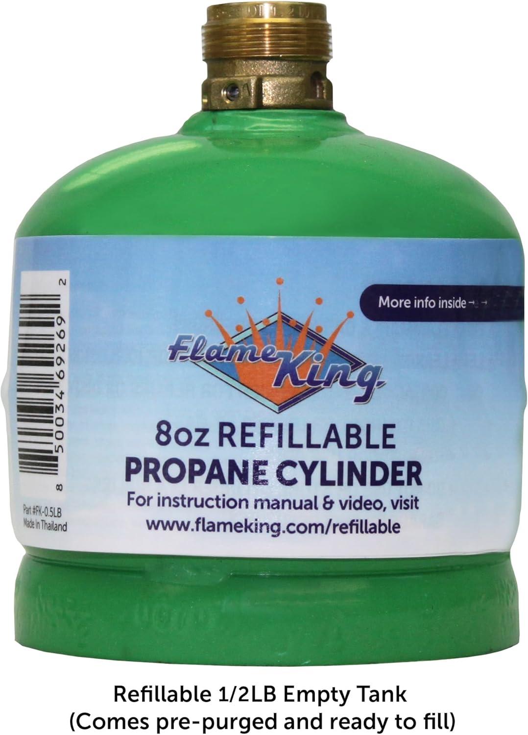 SAVE MONEY, REDUCE WASTE: Stop wasting money on disposable tanks and start saving money with our reusable, safely, and easily refillable propane cylinders; Keep disposable propane tanks out of the environment by using the Flame King 1/2Lb refillable cylinders