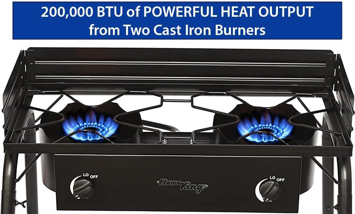 Flame King 200,000 BTU Propane Burner Gas Stove Heavy Duty Turkey Fryer/Camp Cooker, Portable with Stand Great for Outdoor Cooking, Home Brewing & Canning(Double Burner 200K BTU)