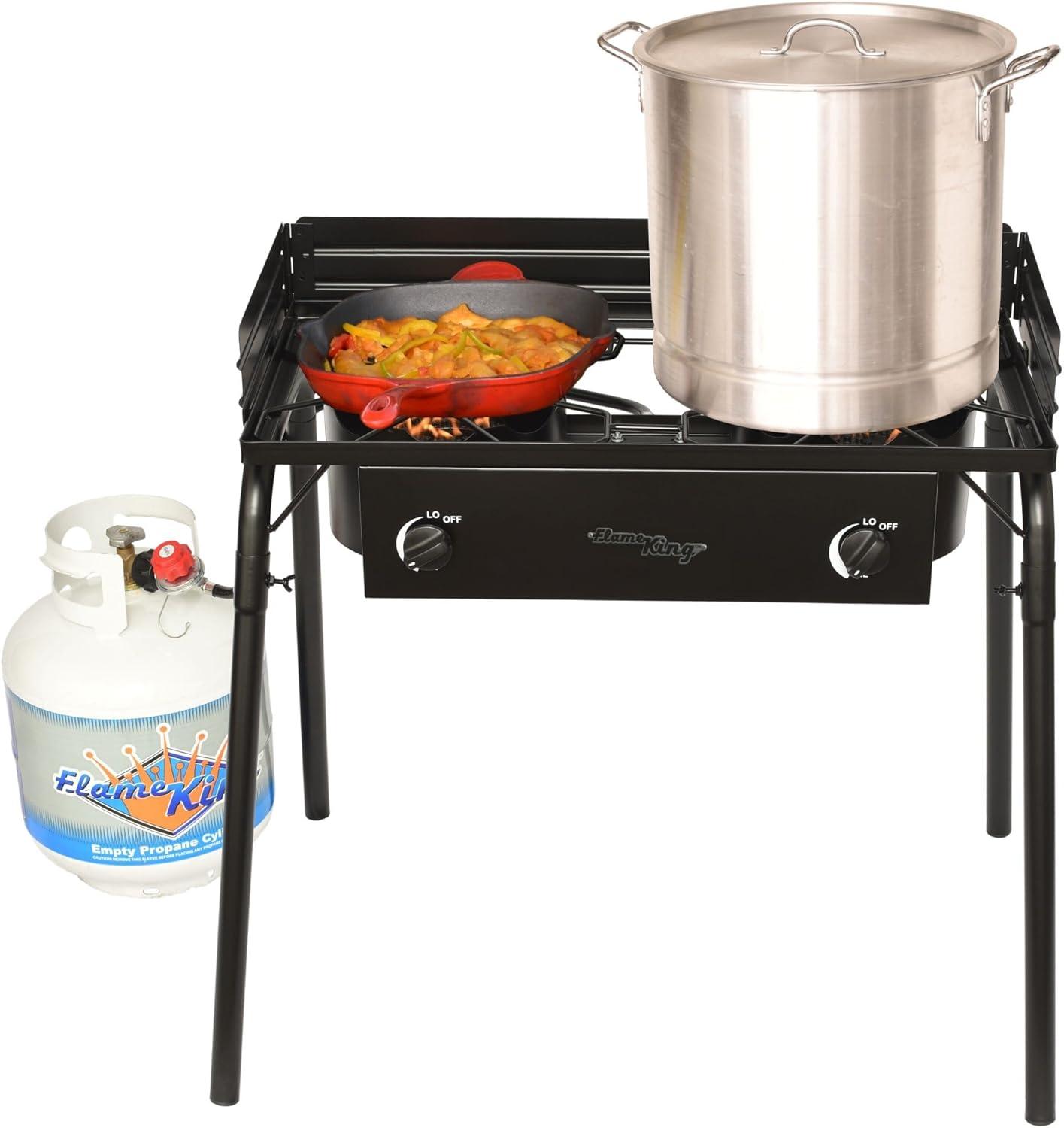 Flame King 200,000 BTU Propane Burner Gas Stove Heavy Duty Turkey Fryer/Camp Cooker, Portable with Stand Great for Outdoor Cooking, Home Brewing & Canning(Single Burner 100K BTU)