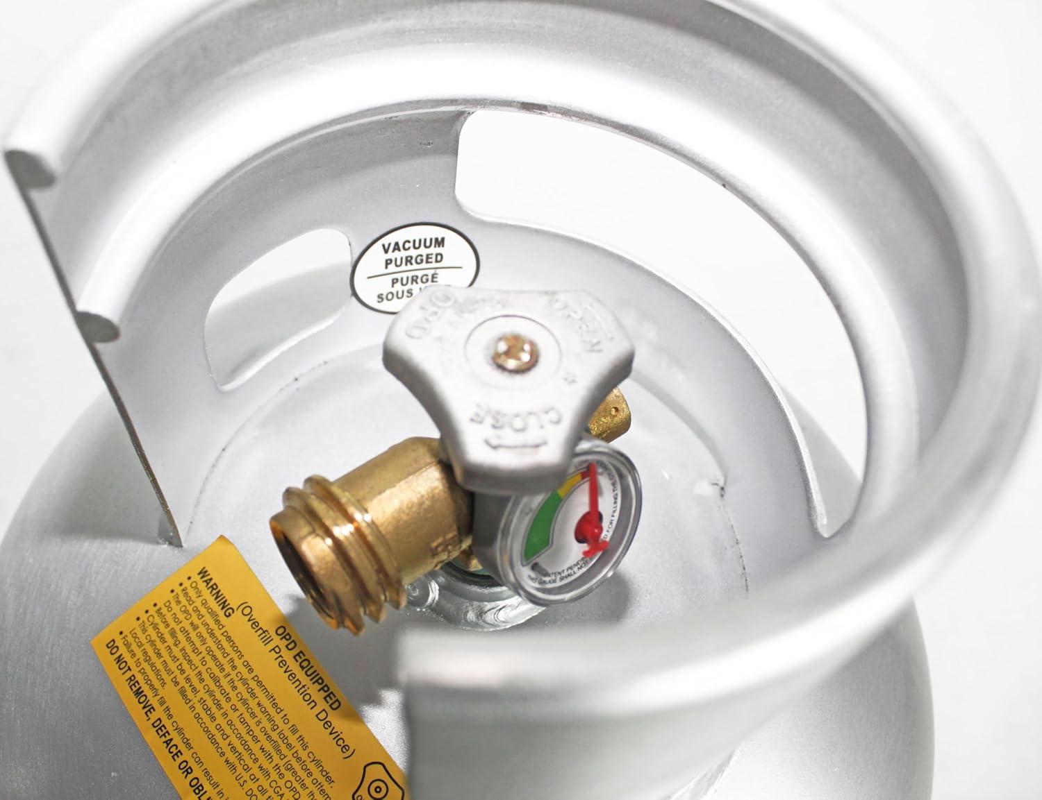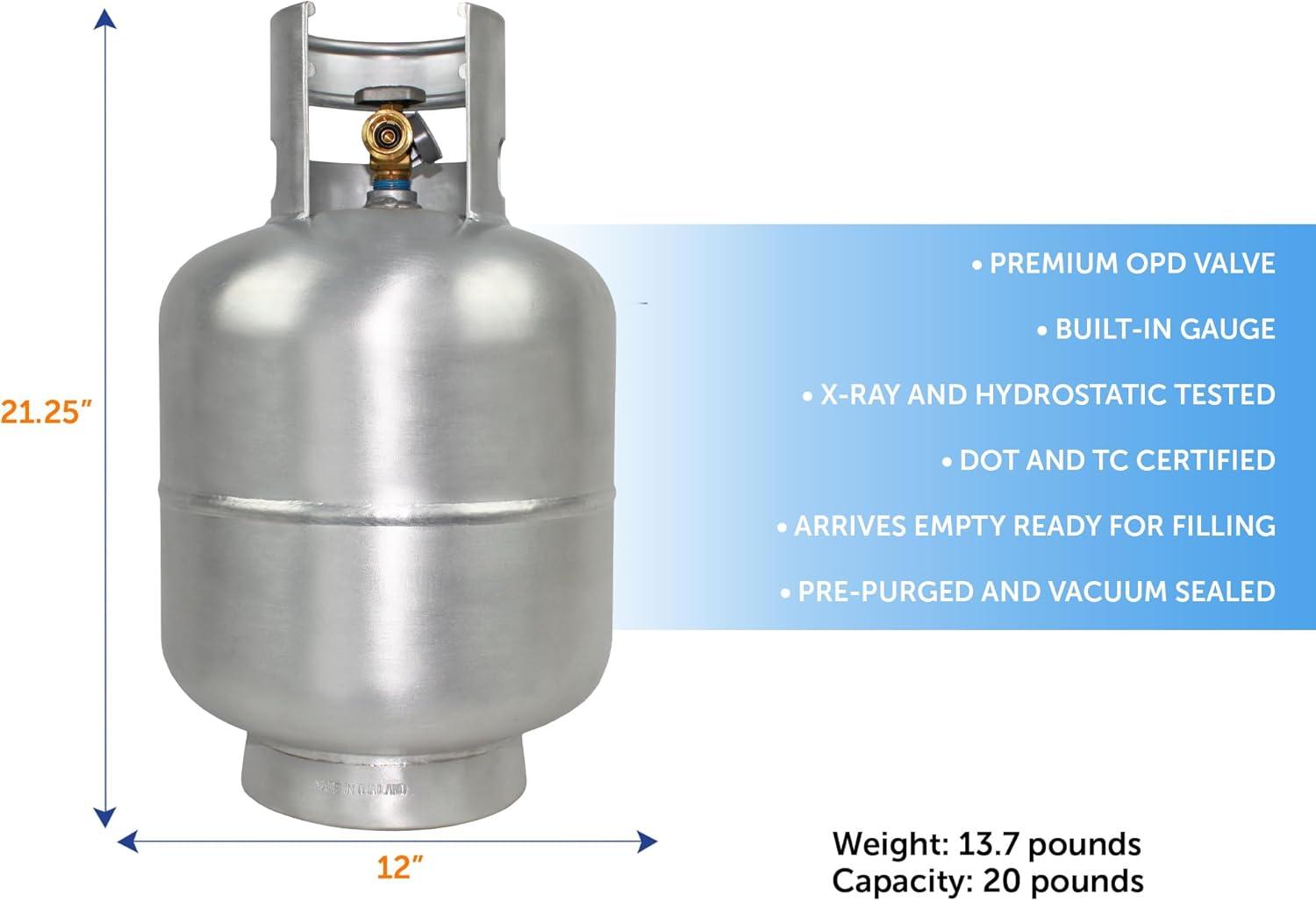EMPTY TANK: Pre-purged vacuum ready for filling with propane; built from high-grade aluminum construction with long-lasting durability