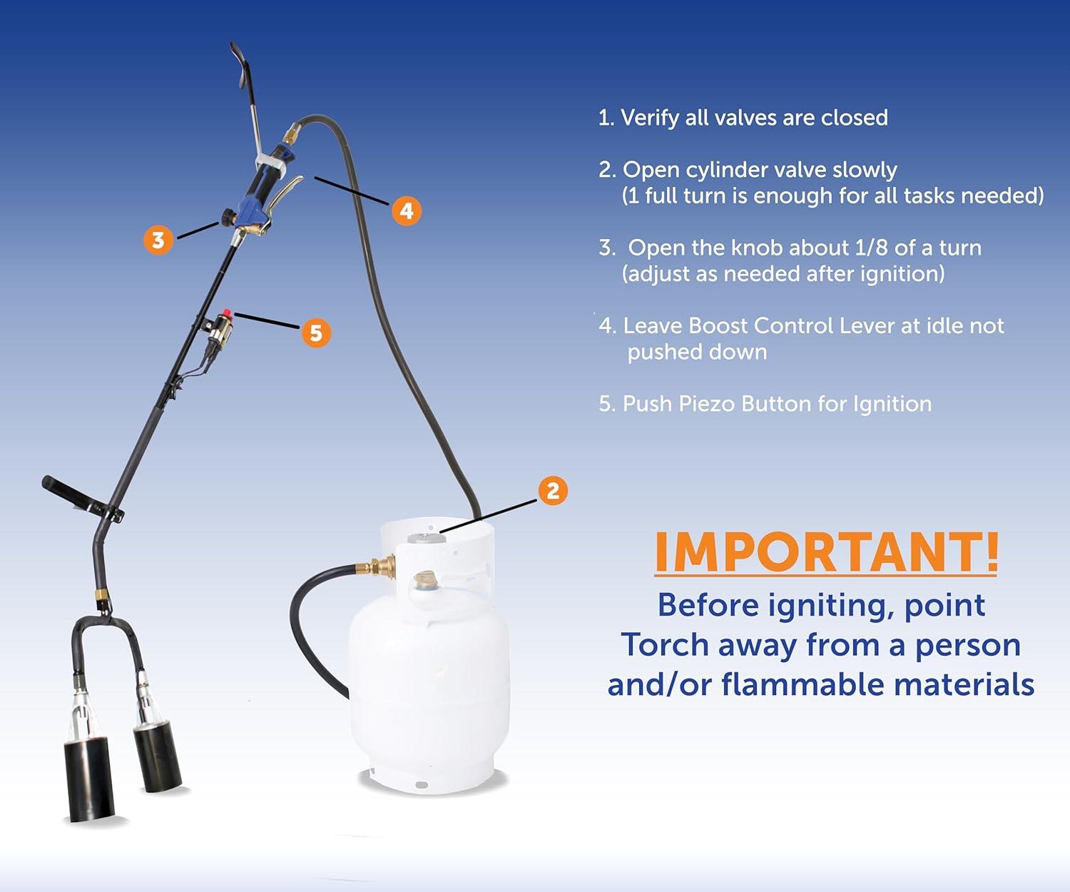 DUAL LARGE WIDE BARRELS @ 500,000 BTU EACH: Great choice for heavy-duty jobs around your home; comes with a torch adjusting valve to easily control flame size; the idle boost control lever is used to create a super flame