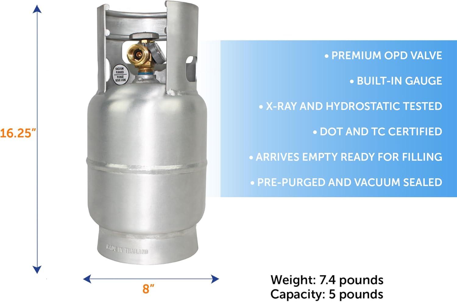 EMPTY TANK: Pre-purged vacuum ready for filling with propane; built from high-grade aluminum construction with long-lasting durability