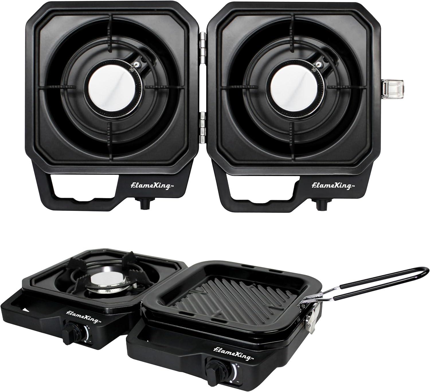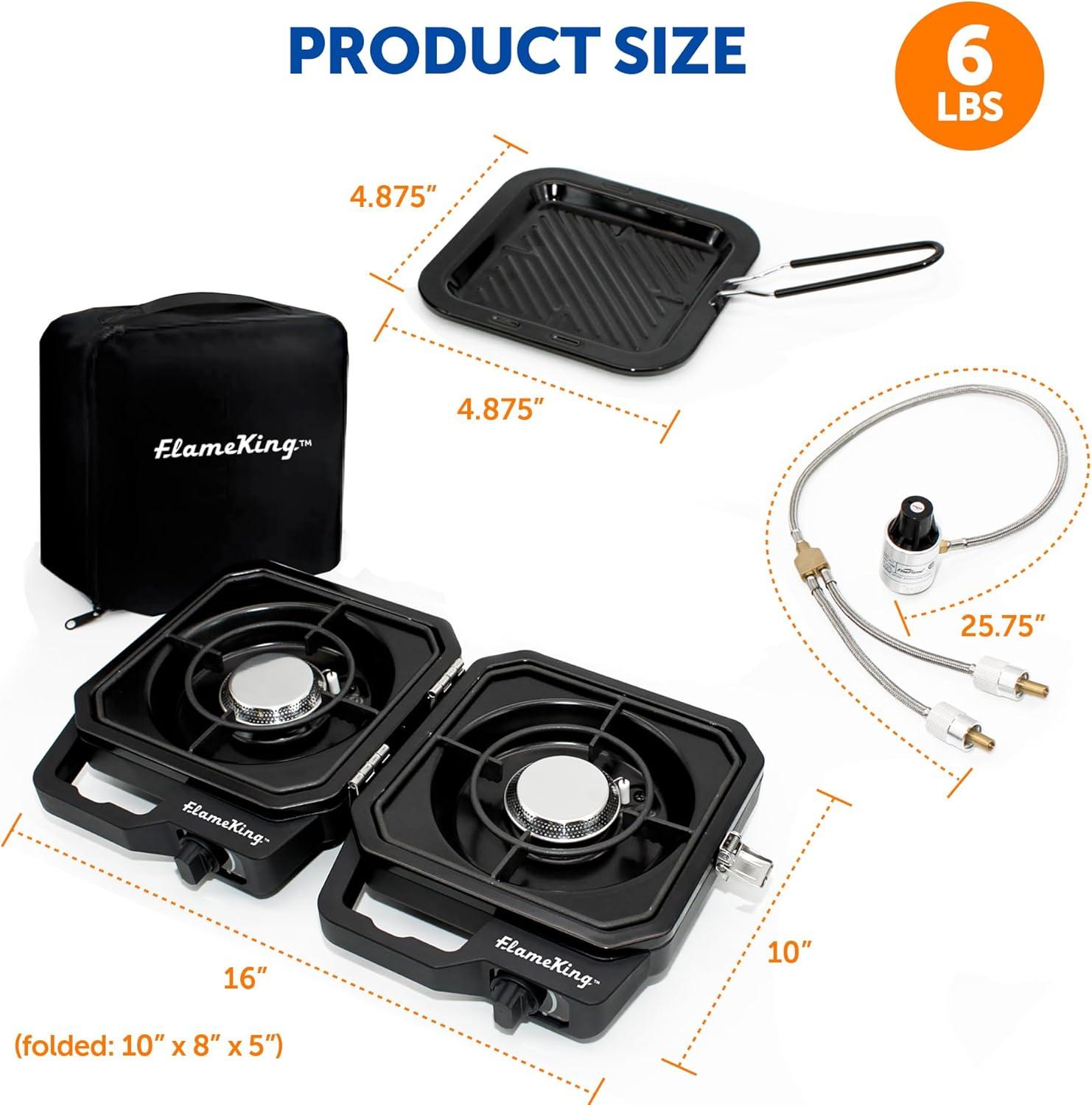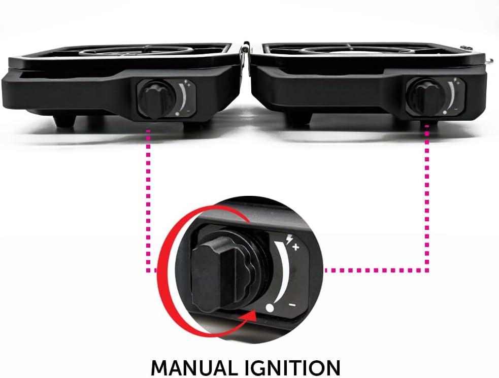 DUAL BURNER DESIGN (total of 12,000 BTU heat output): Cook 2 dishes at once—grill, sear, or sauté on one burner while brewing coffee or frying eggs on the other