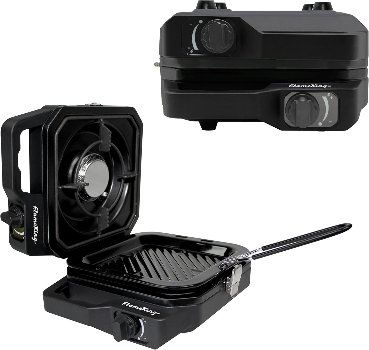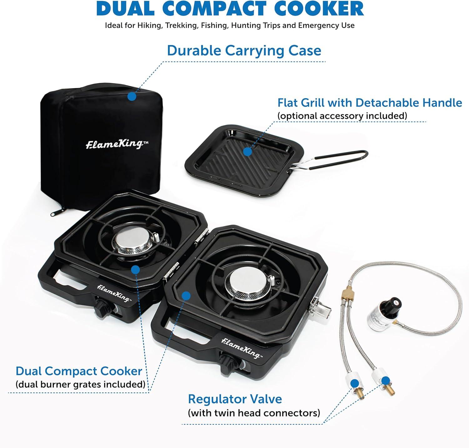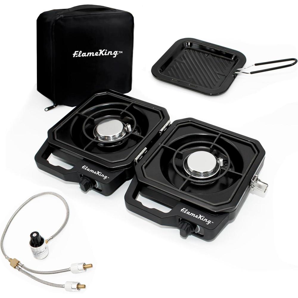 DUAL BURNER DESIGN (total of 12,000 BTU heat output): Cook 2 dishes at once—grill, sear, or sauté on one burner while brewing coffee or frying eggs on the other