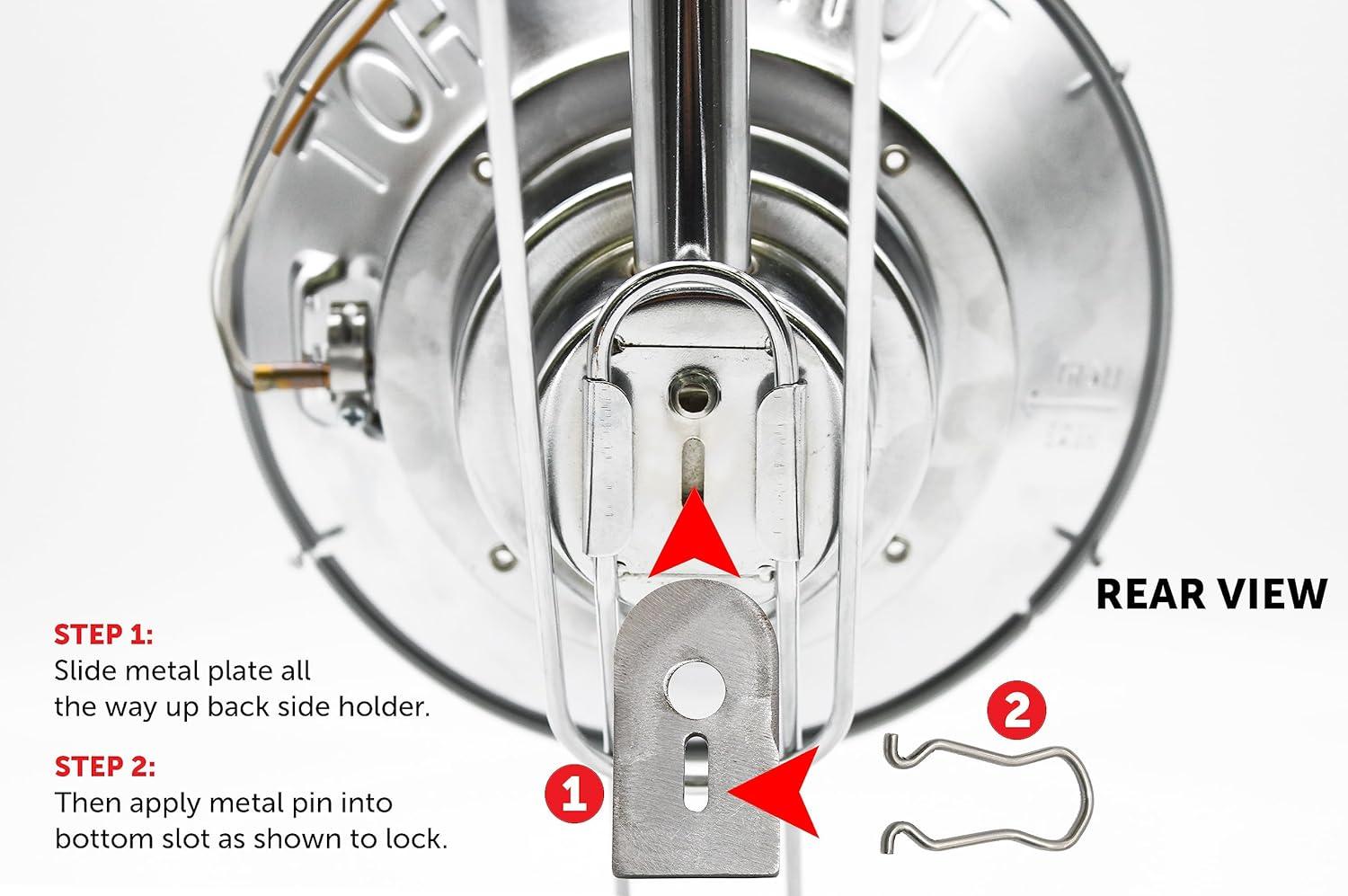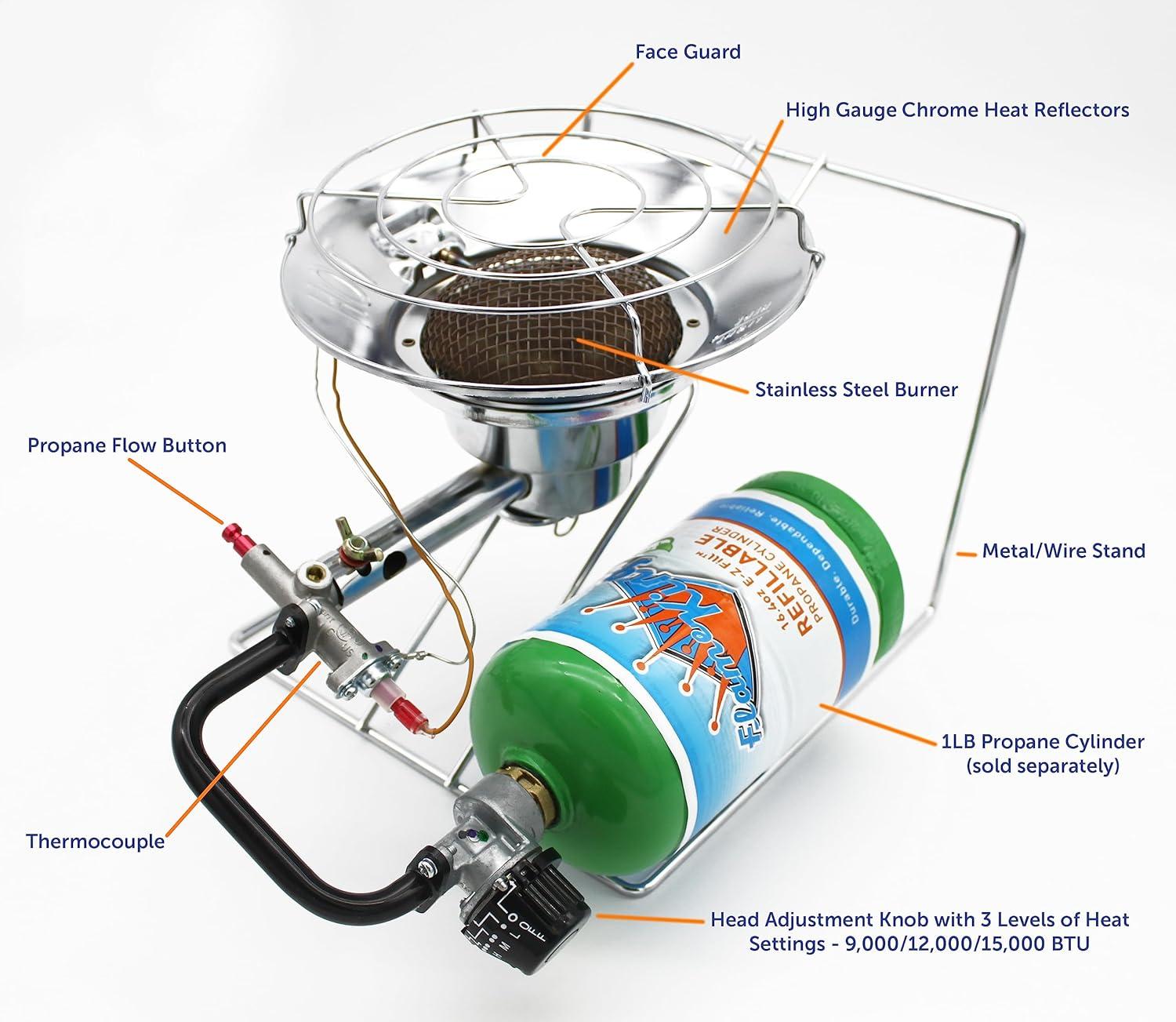 HIGH GAUGE CHROME HEAT REFLECTORS and stainless burners heat up to 15,000 BTU and last up to 2 hours with a 1LB propane cylinder