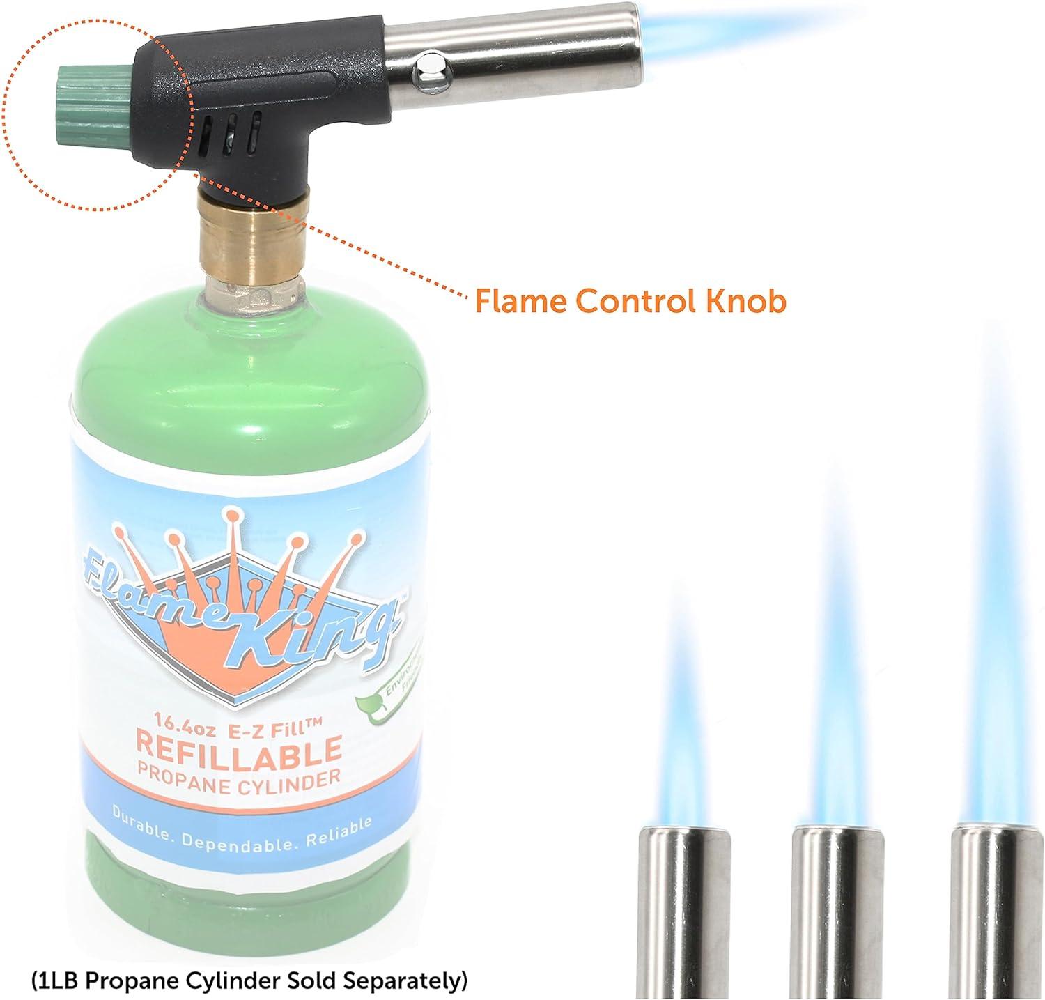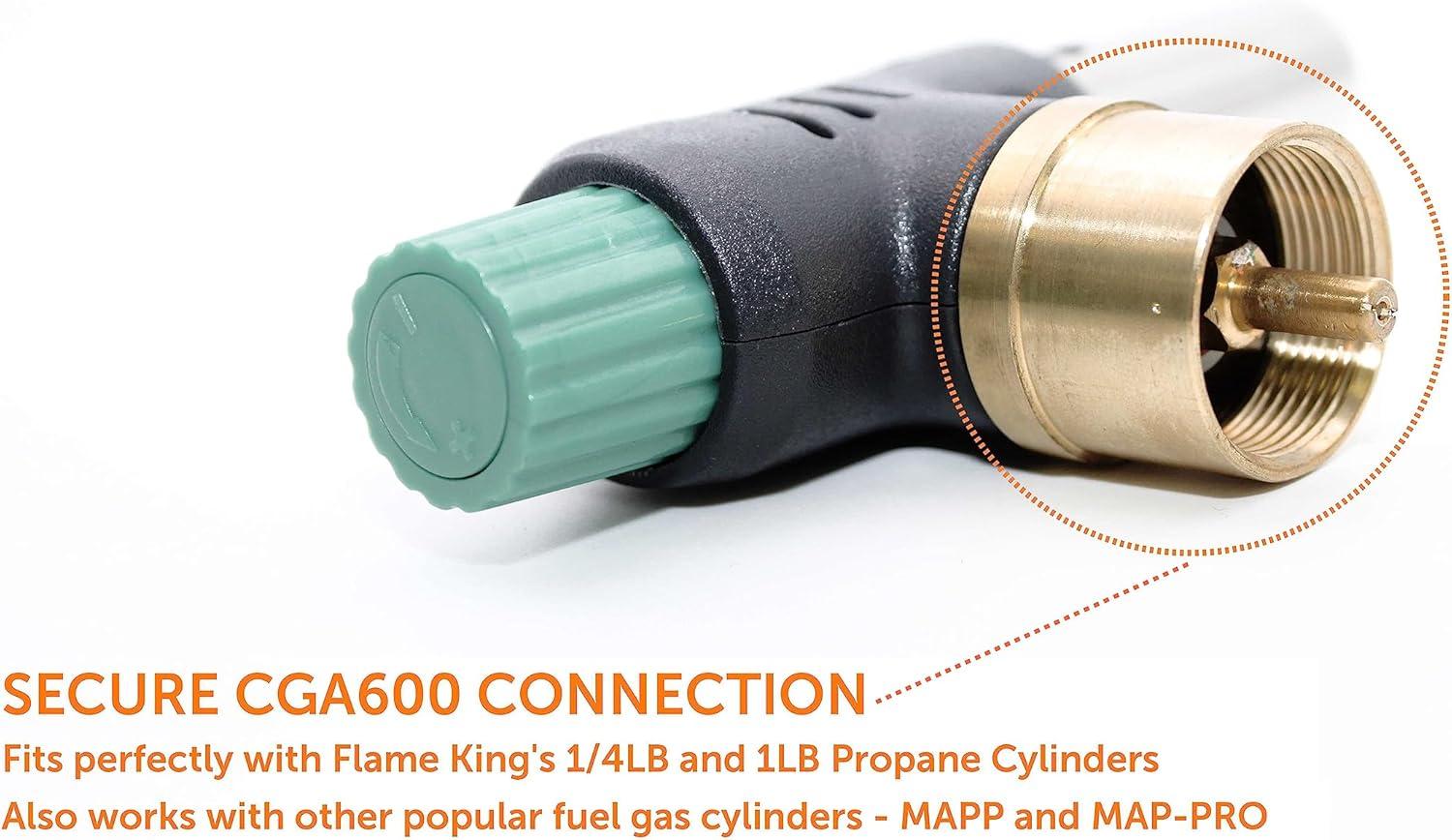 SECURE CGA600 CONNECTION: Fits perfectly with the Flame King's 1/4LB and 1LB Propane Cylinders; also works with popular fuel gases – standard 1lb Propane cylinders, MAPP, and MAP-PRO