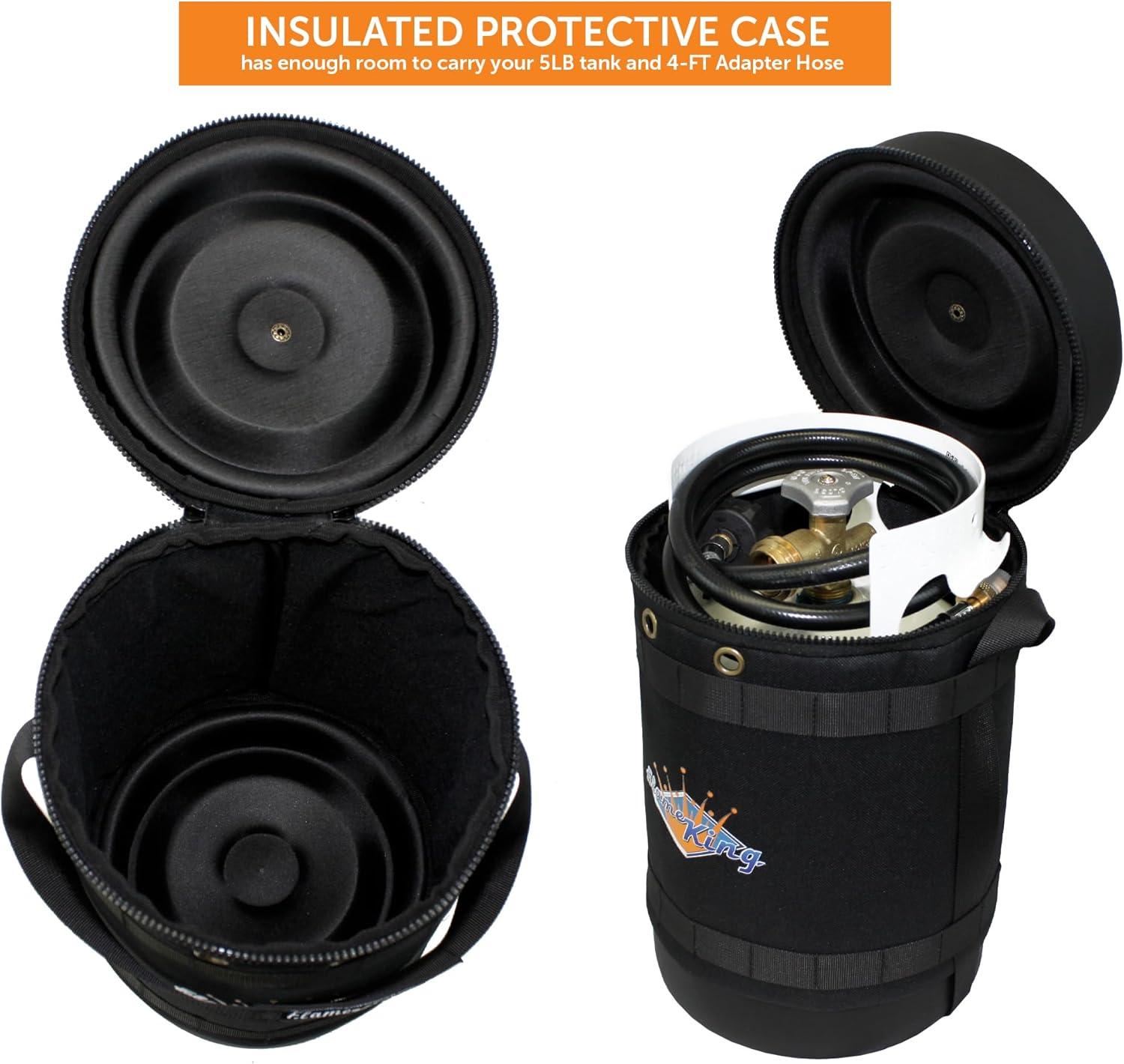 Flame King Gas Hauler Kit – Insulated Protective Carry Case, 5LB Propane Tank and Adapter Hose for Camping and Outdoor Adventures, Black/White
