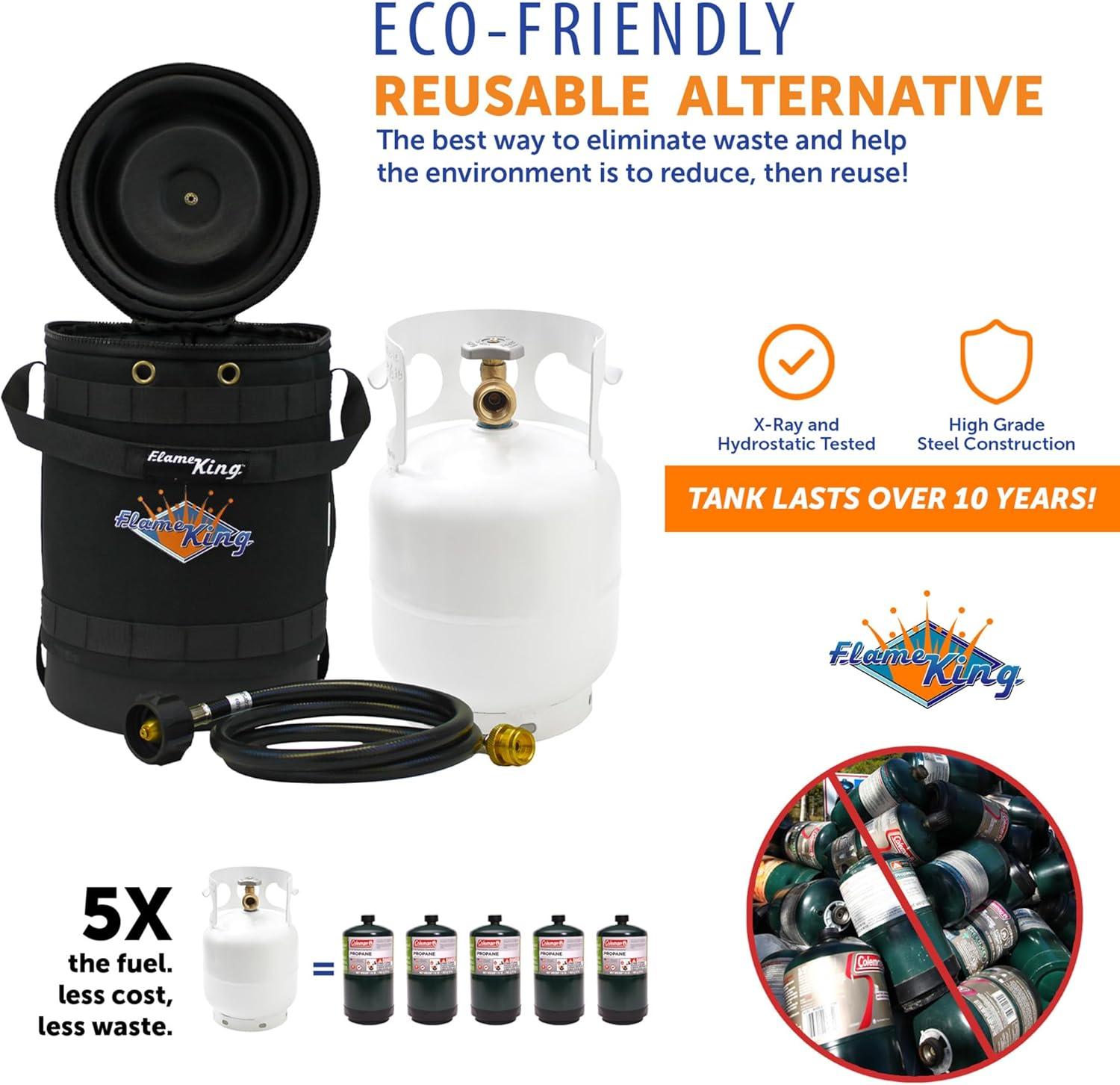 YOUR PERFECT CAMPING BUDDY: Bundle comes with the Flame King 5LB (1.2 gallons) refillable propane tank, propane rubber hose YSN-QCC-1LB and the insulated protective carrying case