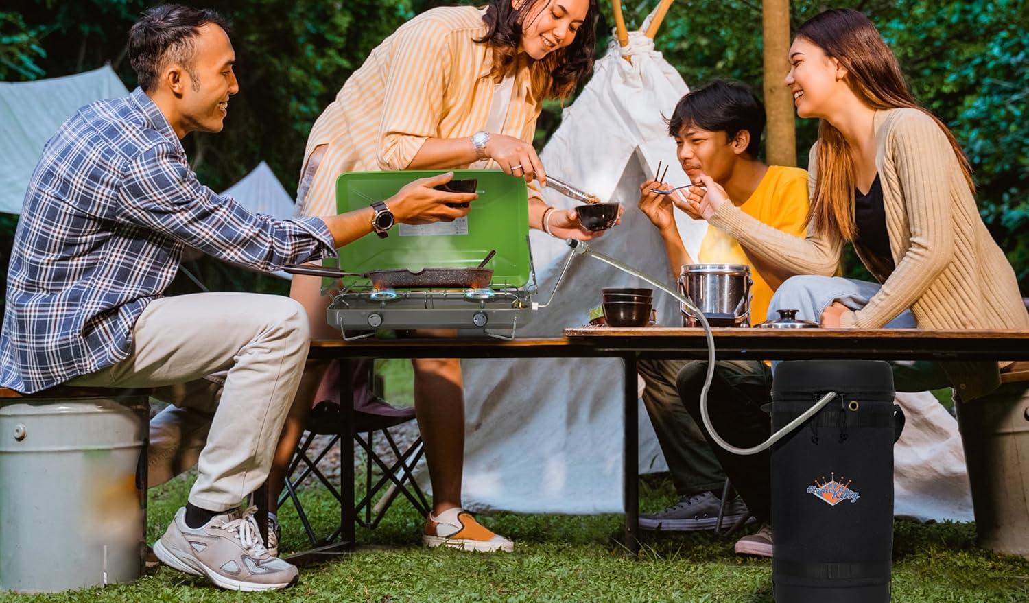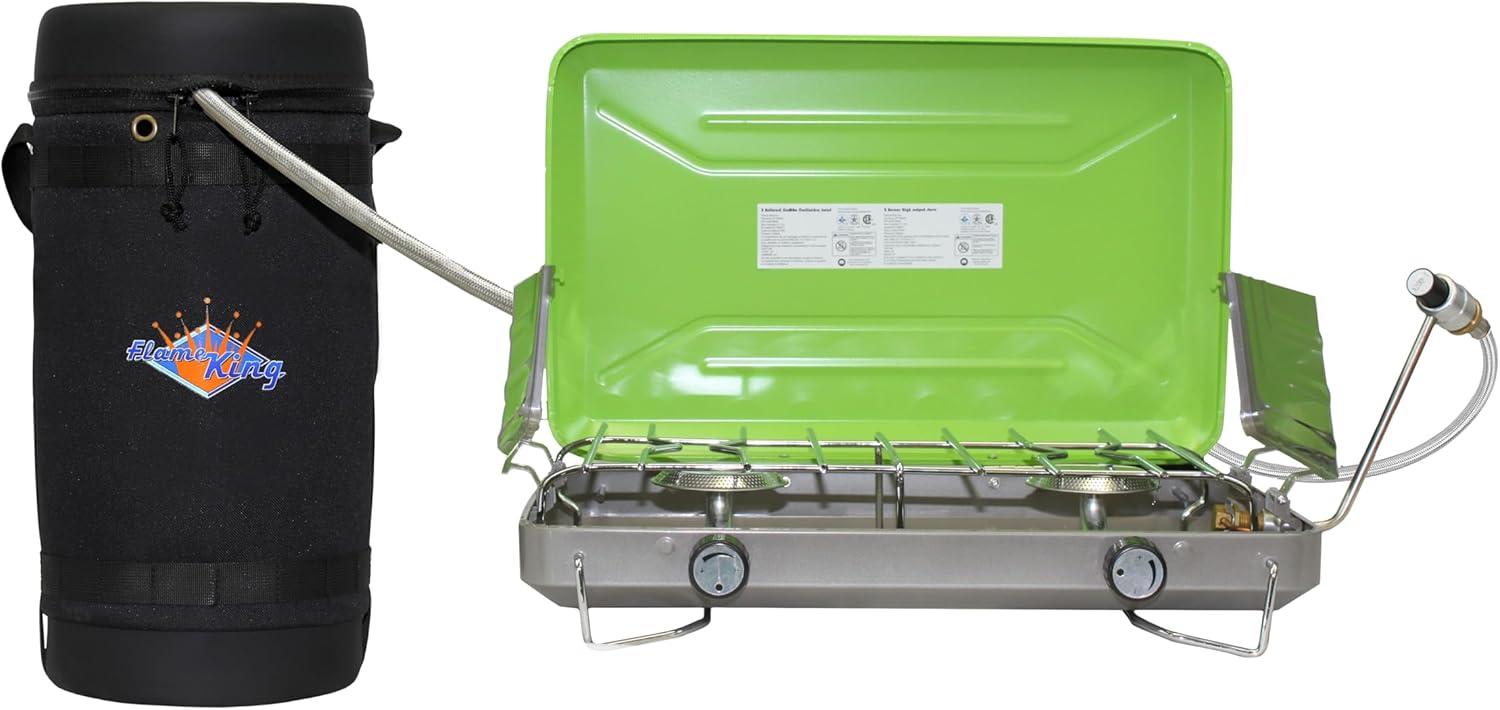 YOUR PERFECT CAMPING BUDDY: Bundle comes with the Flame King 10LB refillable propane tank, 5-ft steel braided propane hose SS-QCC-1LB, and the insulated protective carrying case