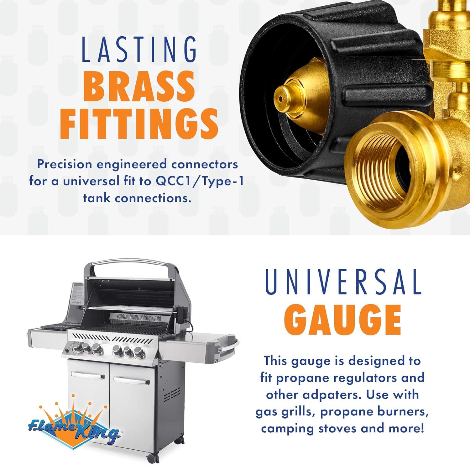 Flame King Propane Tank Gauge Level Indicator Leak Detector Gas Pressure Meter Color Coded & Glow in the Dark Universal for Cylinder, BBQ Gas Grill, RV Camper, Heater and More Appliances, Brass