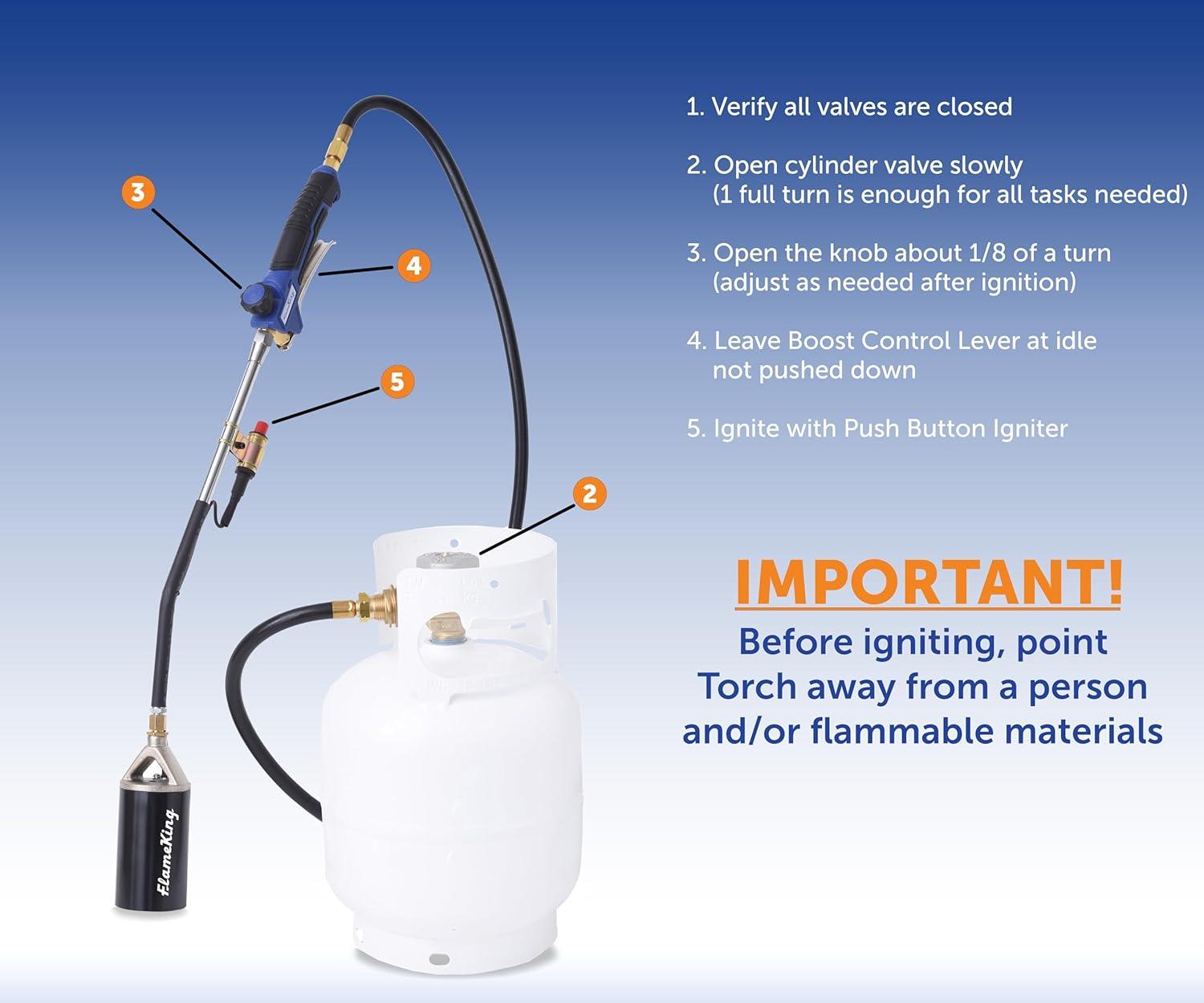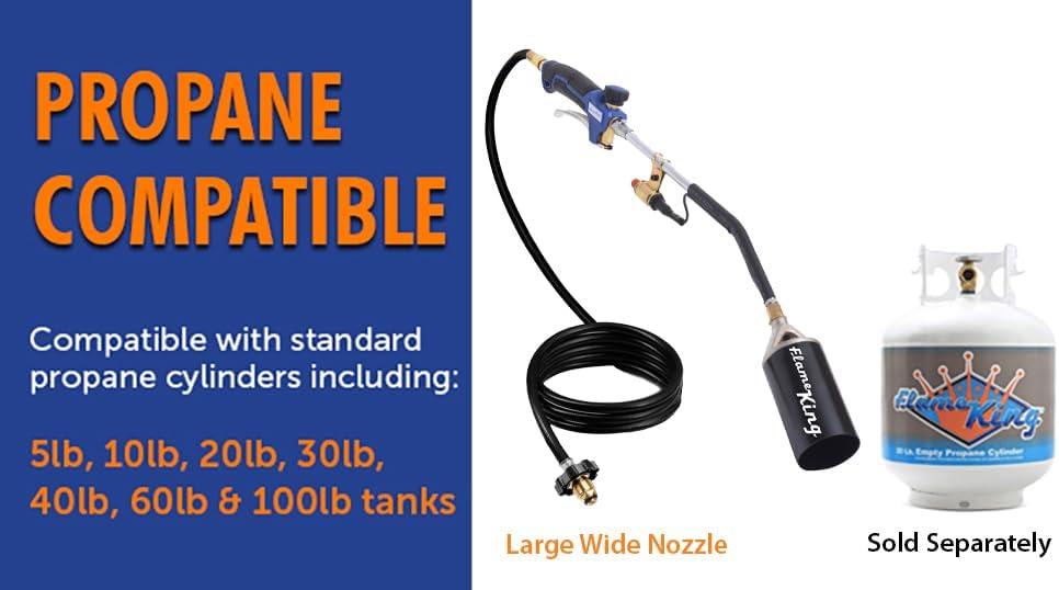 ARRIVES FULLY ASSEMBLED: This torch is 36 inches long and is ready to use right out of the box; includes a 10-foot hose, allowing you to access hard-to-reach areas and cover more ground without constantly moving the propane cylinder
