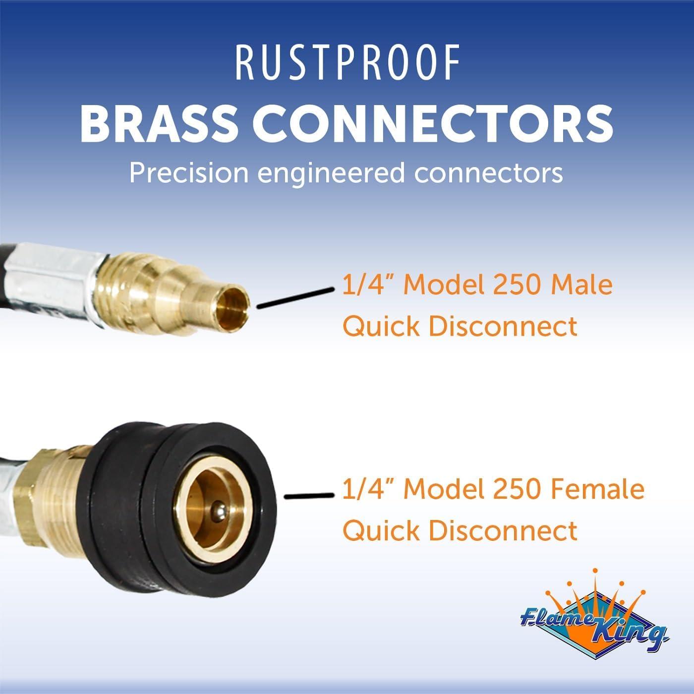 Model 250 Quick Disconnect Plug hose assembly used for connecting a small portable camping appliance such as a grill, heater, or lantern with a Male QD Plug in the inlet to a Female Quick Disconnect permanently attached to the piping system. Allows complete breakdown of the appliance and hose.