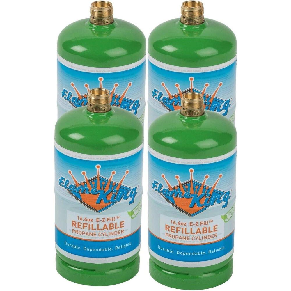 The Flame King 1LB (16.4oz) – (4-pack)-refillable propane cylinders fit all appliances that today's non-refillable tanks work with. This propane bottle is legally & lawfully refillable & transportable – just like your BBQ tank is. Our unique & patented valve design is not available from any other manufacturer. These refillable propane cylinders are perfect for practically every Mr. Heater, Weber, Coleman & similar outdoor type applications that would fit a disposable tank. Spend your money wisely & buy the last 1 lb propane cylinder you will ever need! Tossing a single-use disposable tank is just a silly waste of resources & can be a potential huge problem in the waste stream! Join the eco-revolution! Please note: these cylinders fill fastest & safest with our commercial Flame King refill adapter – not included but available with our refill kit! High-grade steel construction – X-ray & Hydrostatic tested – powder coating for long lasting exterior protection – dot & TC certified for 12 years (10 years in Canada) – UL1769 listed.