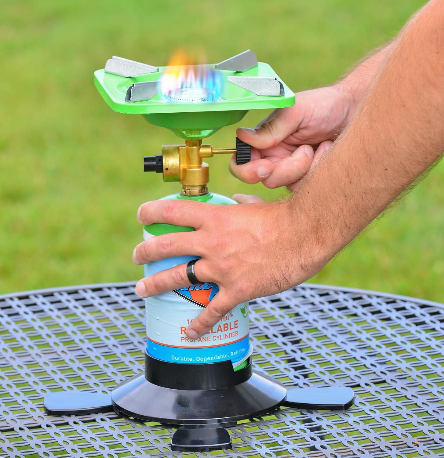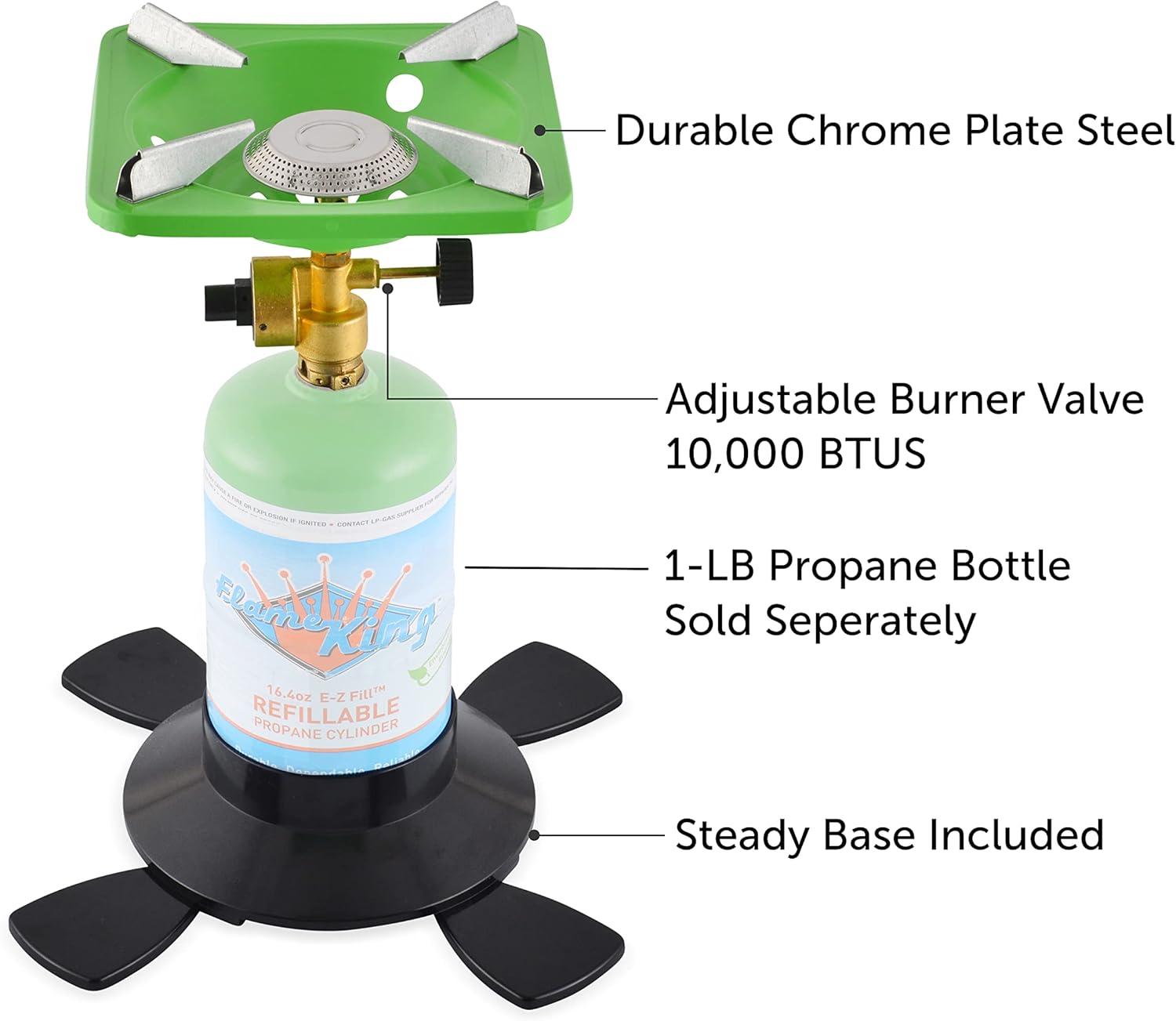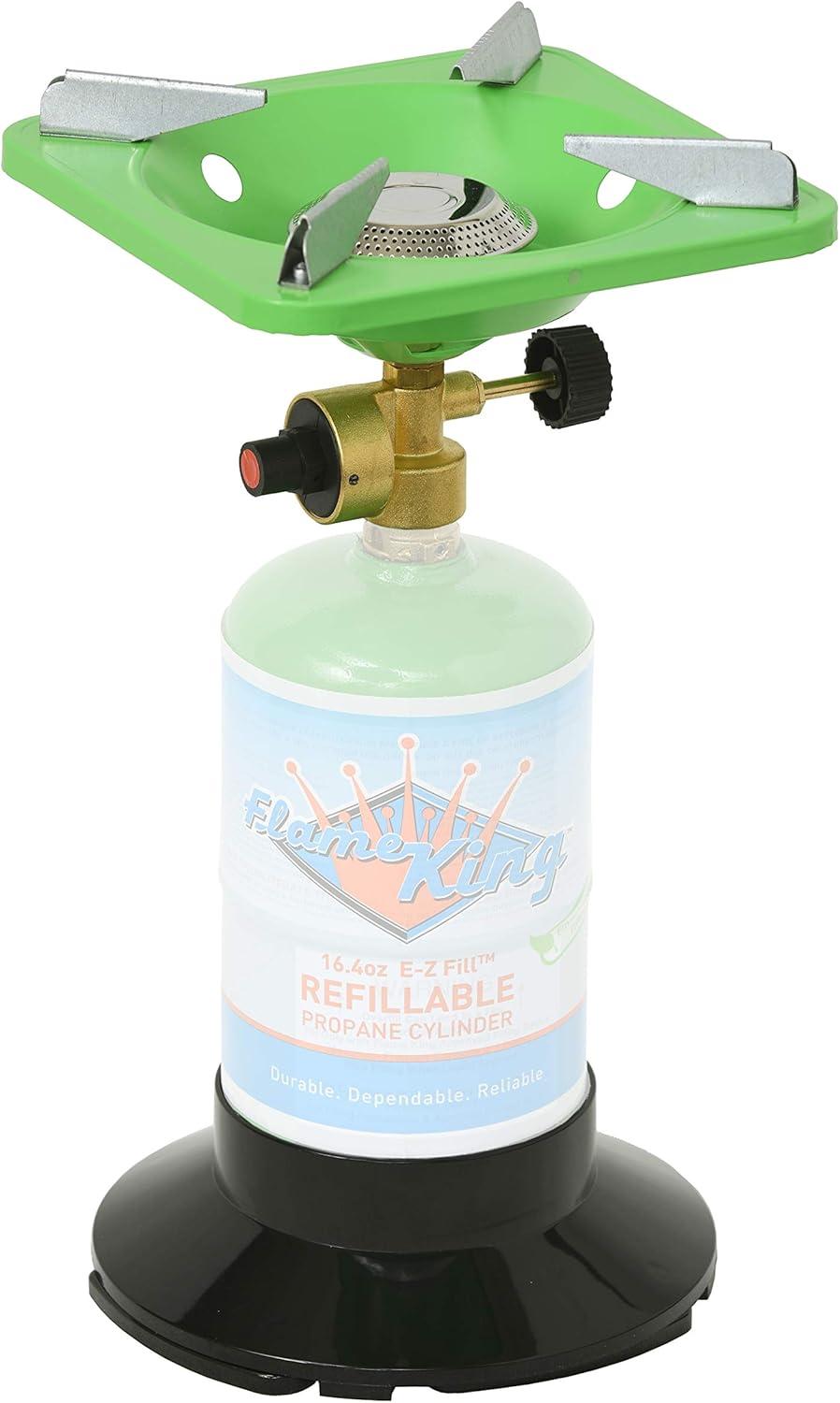 Flame King's lightweight, single burner portable stove and base are your must-haves for camping! The burner and base fit a standard 16.4 oz propane gas cylinder. Medium weight stainless steel and lighter 10″ skillets and saucepans up to 8″ are recommend.